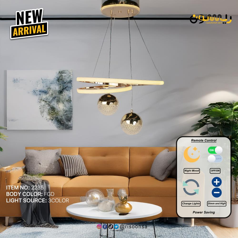 ثريا مودرن LED ذهبية بتصميم حلقتين وكرات إضاءة ثلاثه لون وريموت كنترول
