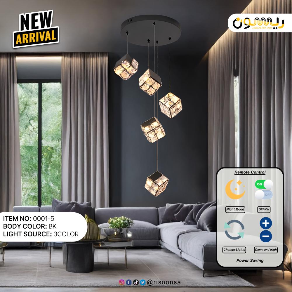 ثريا متدلية 5 قطع مودرن - مكعبات كريستال ذهبية - إضاءة LED بريموت تحكم